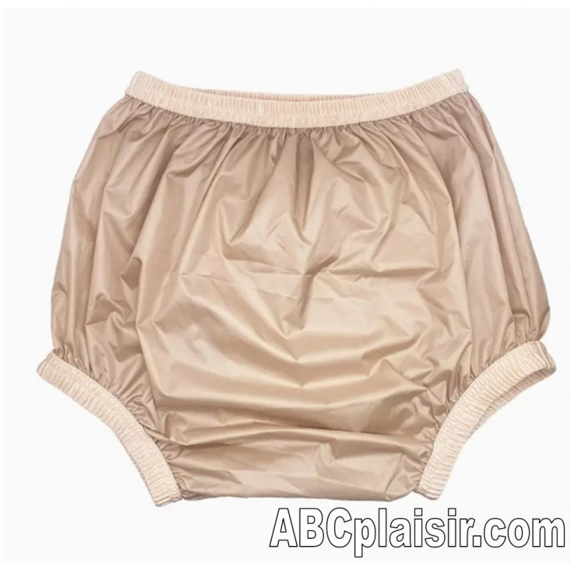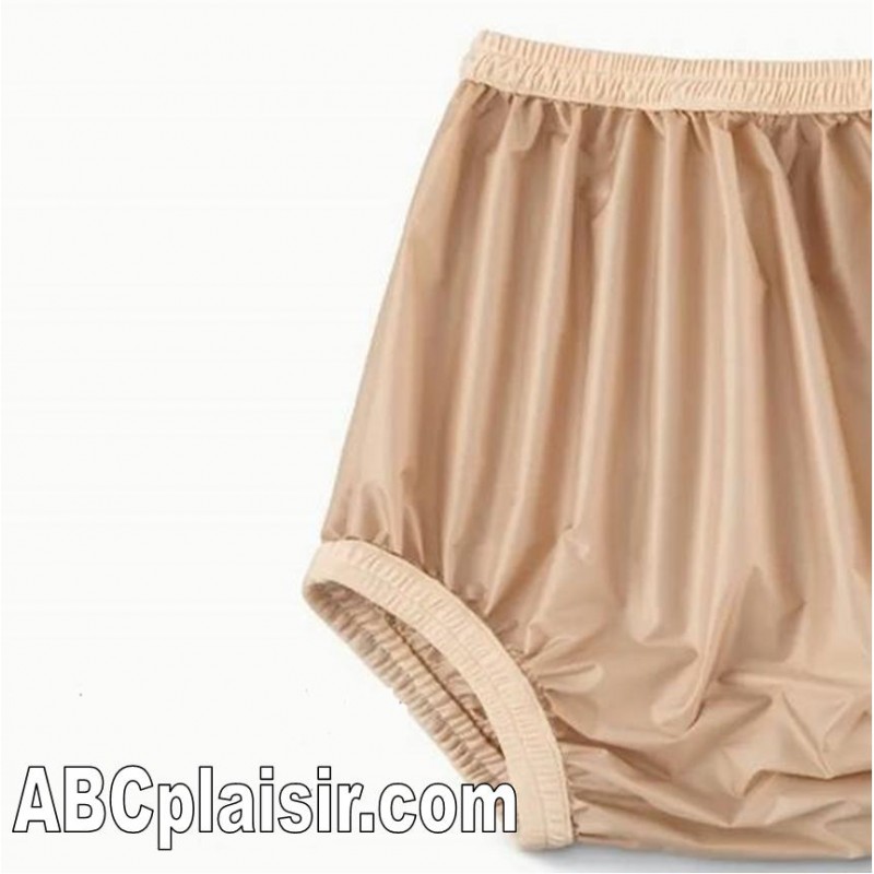 These opaque plastic comfort pants are reusable, waterproof, made of soft plastic, manufactured from soft nylon material that will not harden at low temperatures, and machine washable.